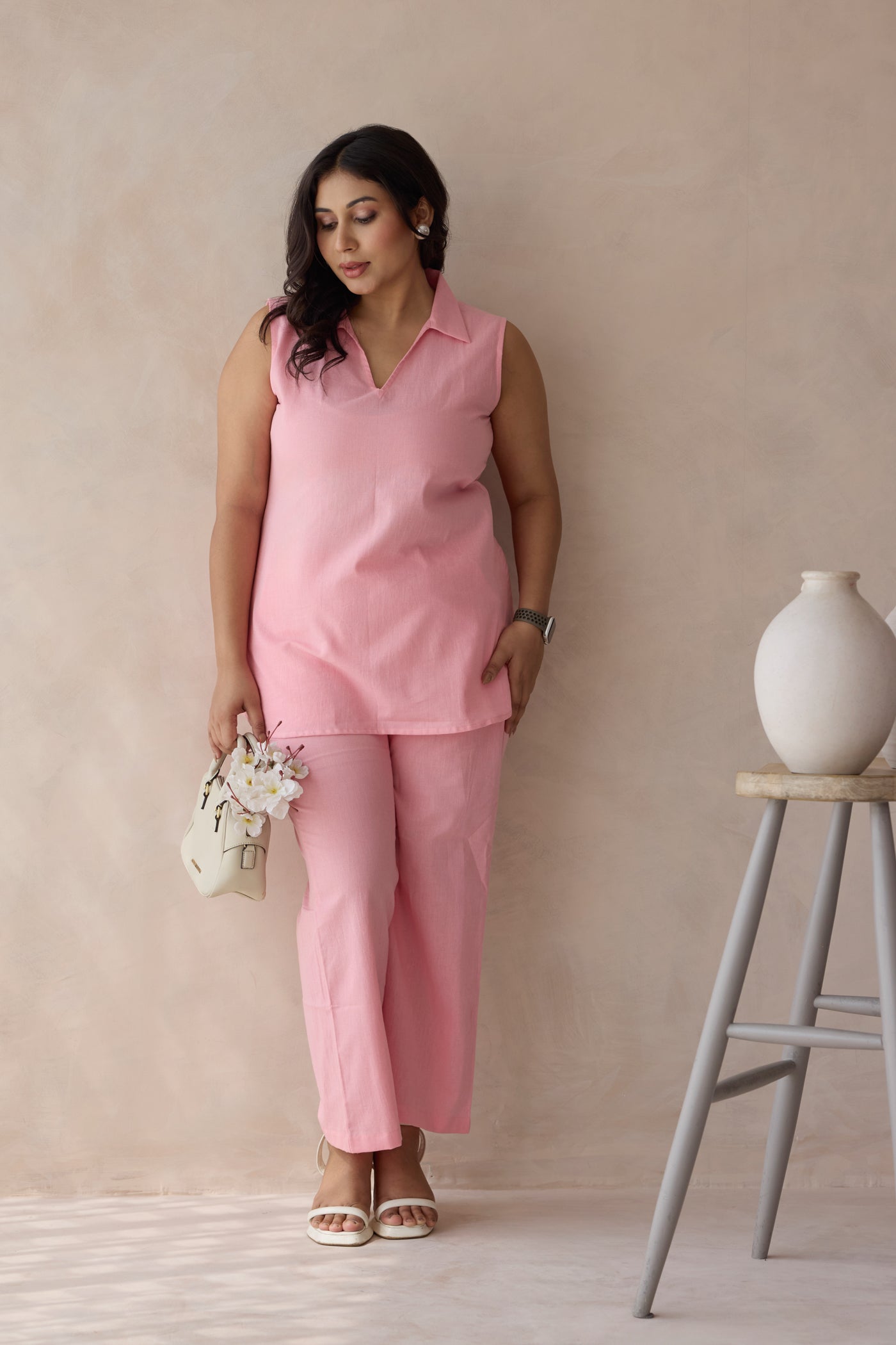 Blush Pink Linen Co-ord Set with Collared Top & Relaxed Bottom