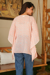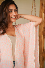 You can't take your eyes off of this absolutely pretty & classic peach Shrug. Made of georgette fabric, it’s a flowy cape which is super lightweight and has kaftan sleeves along with lace detailing on the sleeves and front bodice.