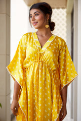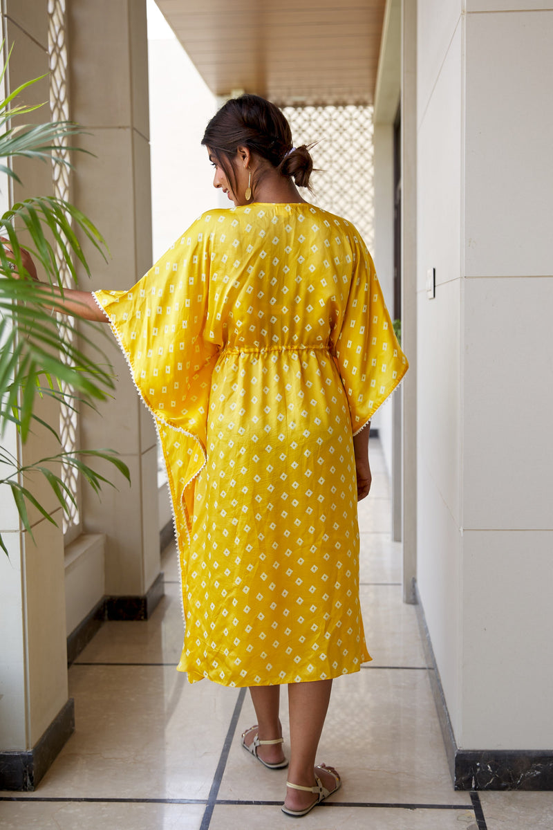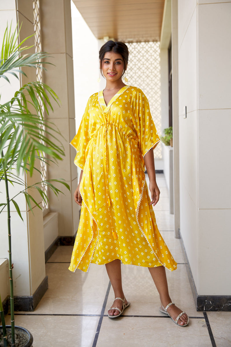 It's a kaftan dress in sunshine yellow color made of 100% Cotton fabric. It comes featuring hand tied bandhani all over, kaftan sleeves with lace detailing all over the edge of the sleeves and neckline. It has a tie up detailing on the waist finished with beautiful handmade tassels. It comes featuring V neck, kaftan sleeves and highlighted neckline. Give your ethnic look a modern update with this beautiful kaftan dress.