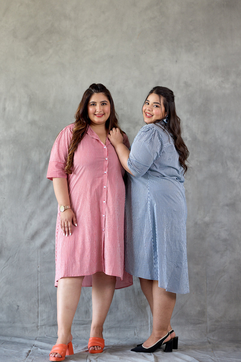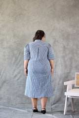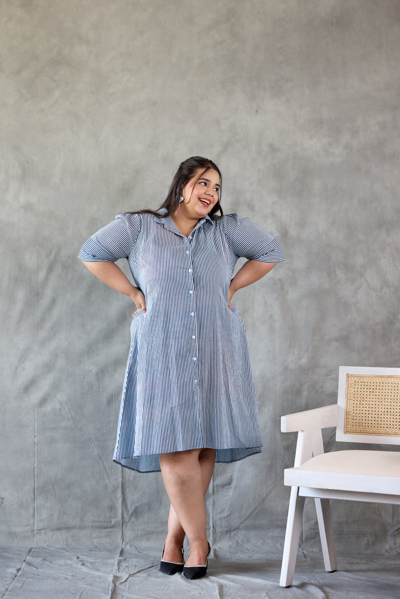 | Elevate your work wear with our Tailored Blue Striped Button-Down Dress, designed for comfort and sophistication. Crafted from lightweight 100% cotton, it features pleated half sleeves, cuffs, and a classic collar with vertical stripes that exude elegance—perfect for transitioning from summer day to night. |