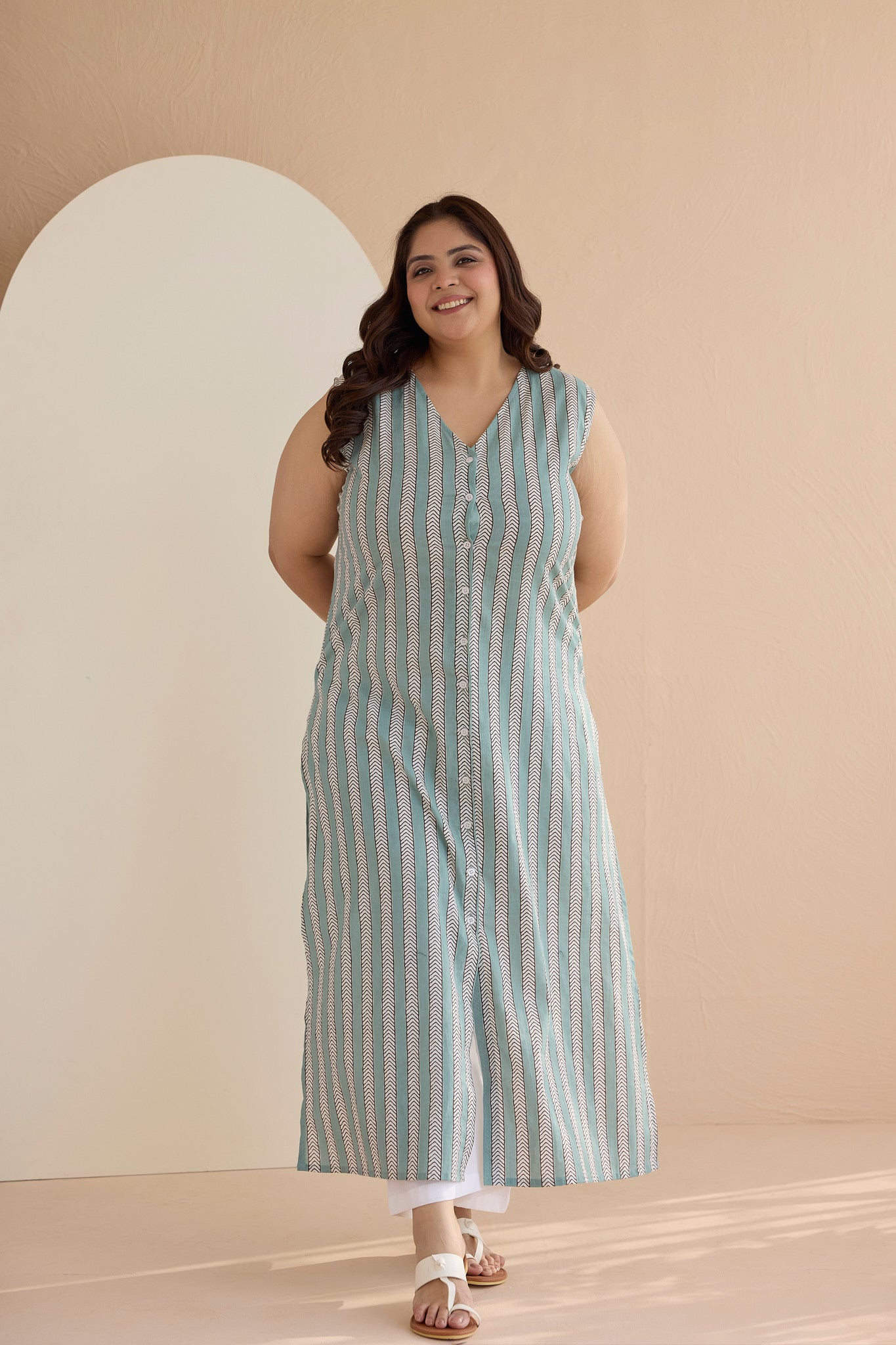 Make a breezy yet bold statement in this Teal Striped Cotton Shirt Kurta Set. Designed in 100% soft cotton, the straight-cut sleeveless kurta draws the eye with its striking teal blue striped pattern and fluid silhouette. A flattering V-neckline and functional front buttons lend a touch of versatility, while the crisp white straight-cut pants, with a comfy elastic waistband complete the effortlessly chic look. Perfect for brunch dates or vacation strolls, this set blends comfort and charm in equal measure.