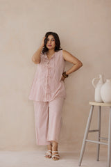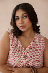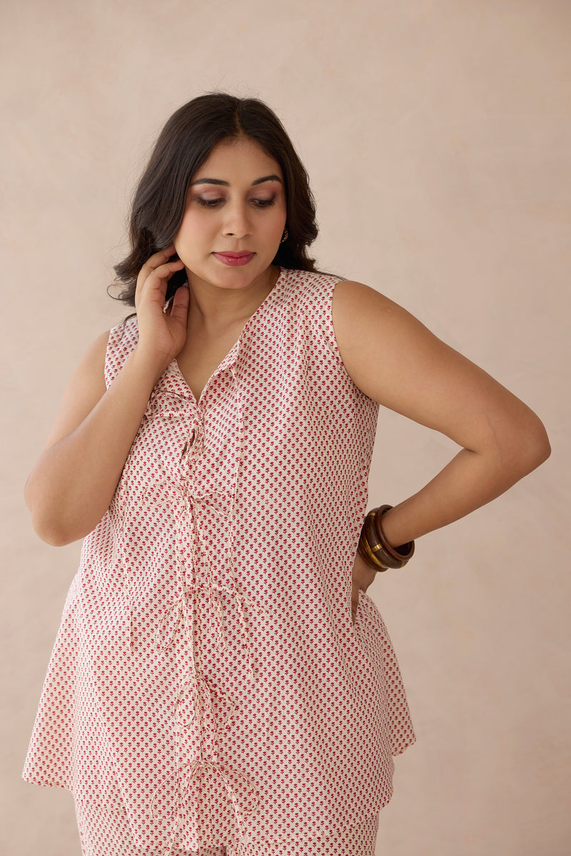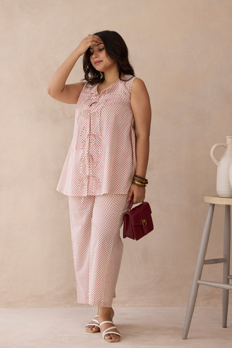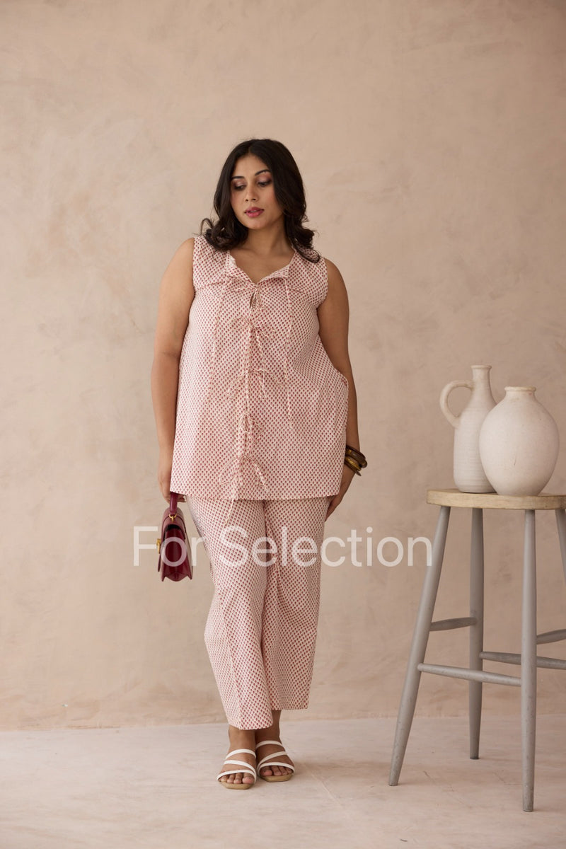 Embrace effortless style with this Tie-Front Style Cotton Co-ord Set featuring a charming all-over Booti print. Crafted from soft, breathable cotton, the sleeveless vest-style top features openable front tie-ups thoughtfully designed to ensure zero gaping, so you stay secure and covered, with no peek-throughs or slips. The matching printed bottoms include an elasticated waistband and two roomy pockets, perfect for carrying your phone, keys, or essentials while you're hustling through the day. Whether you're out for brunch, running errands, or catching up with friends, this co-ord set keeps you cool, confident, and effortlessly chic.