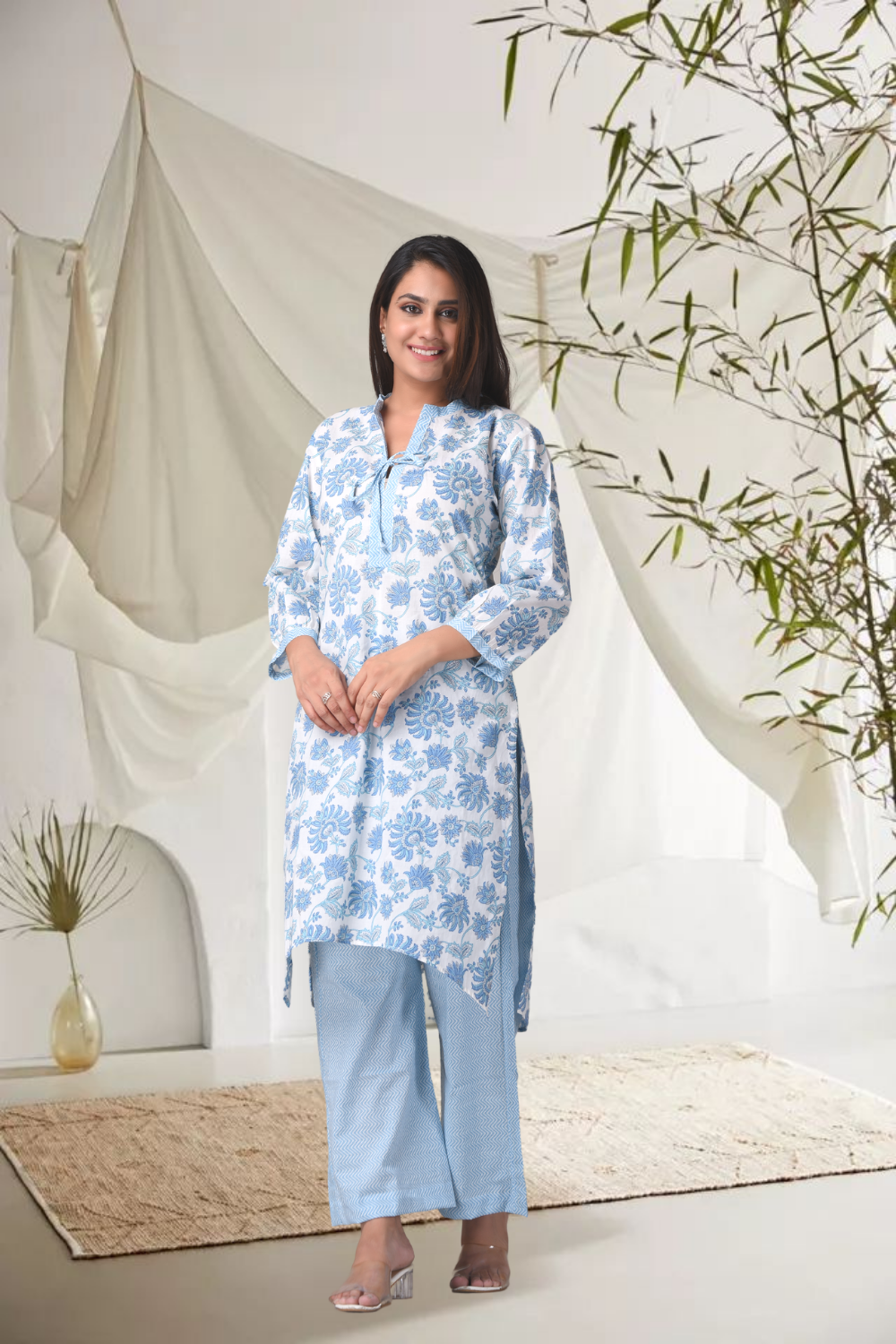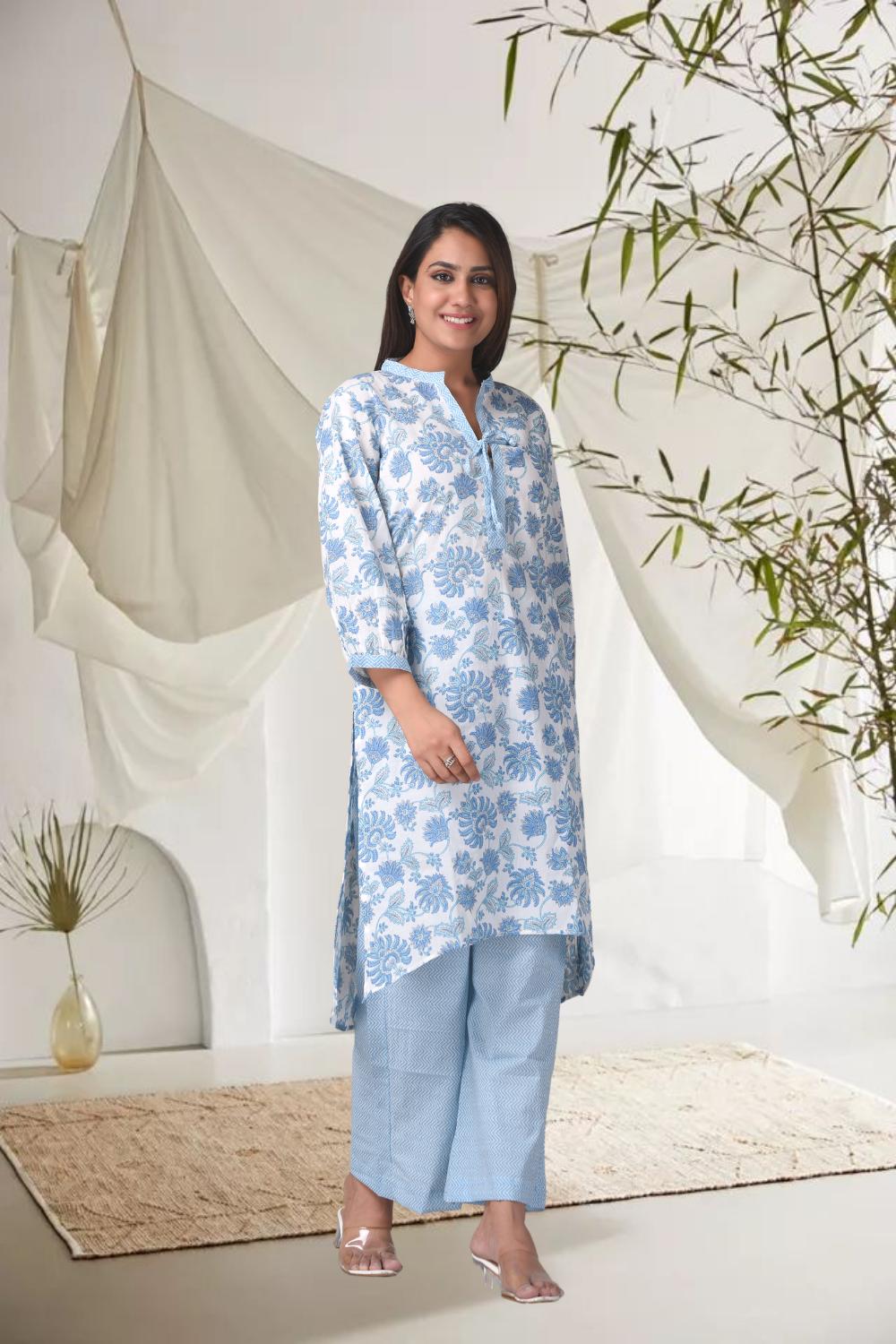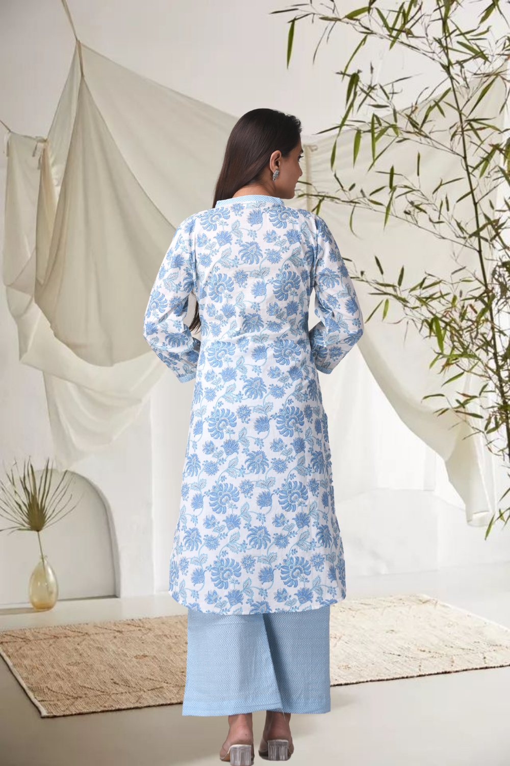 White & Blue Cotton floral hilo kurta pants set - (Set of 2)