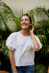 This is a really cute black polka on white top with elasticated sleeves. This top has a relaxed fit and this formal look and can be worn to any party with smart denims or culottes. It's an easy to use fabric which does not crush much.