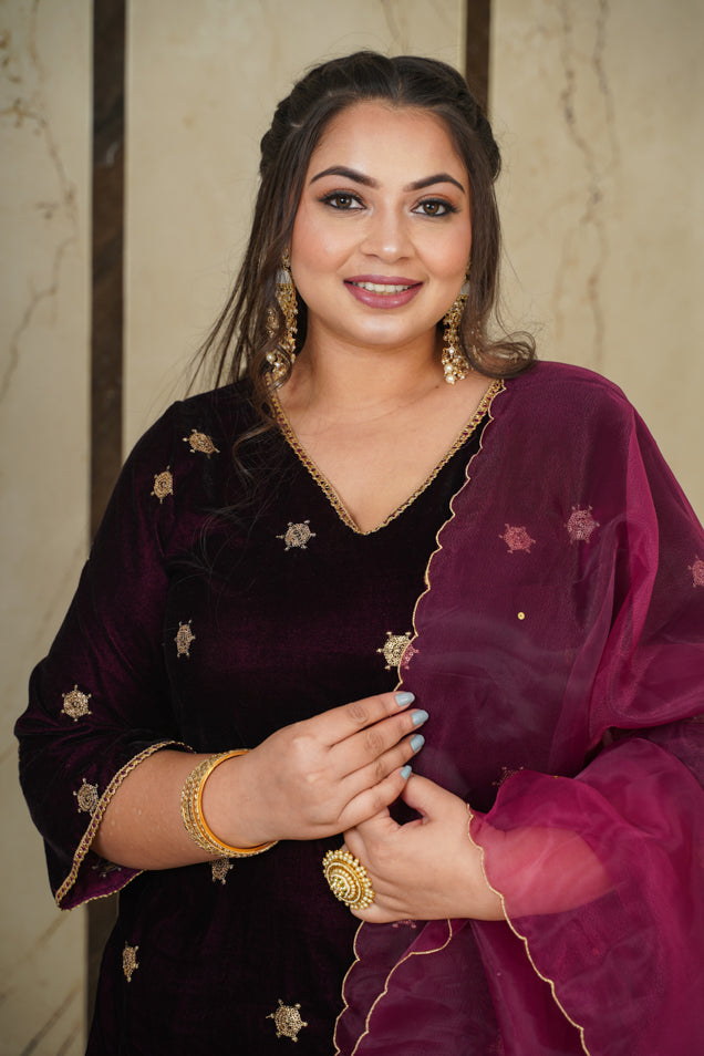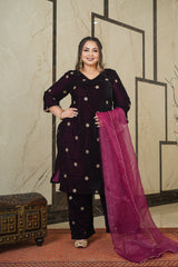 Wine Embroidered Velvet Kurta Suit Set - (Set of 3)