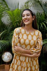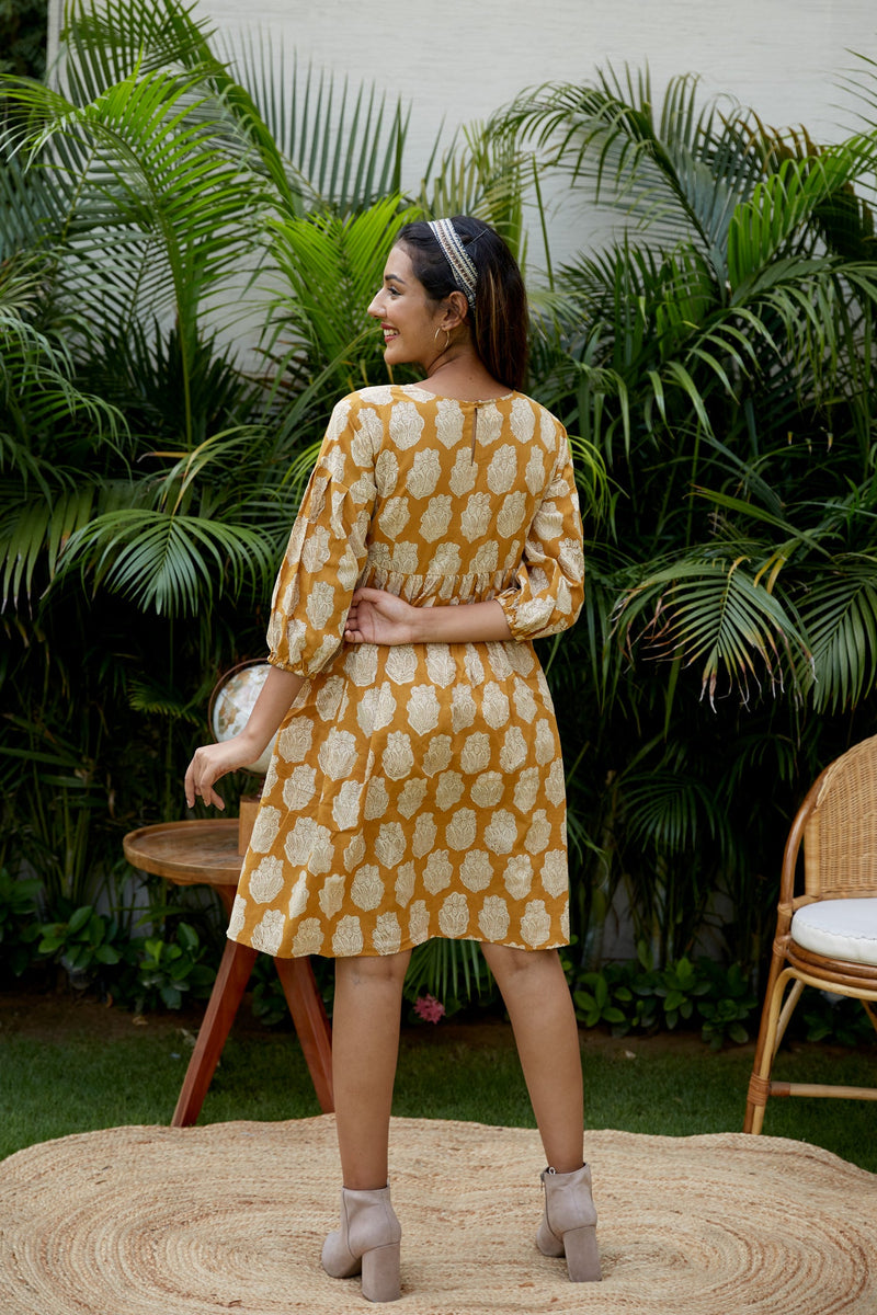 It's a two tier short dress made in Hand Block Printed Cotton fabric in mustard color,with a funky print comes with gathered sleeves. Let simplicity speak for you adorning this mustard printed smart dress. Perfect for your day outing or when you are in a shopping mood.