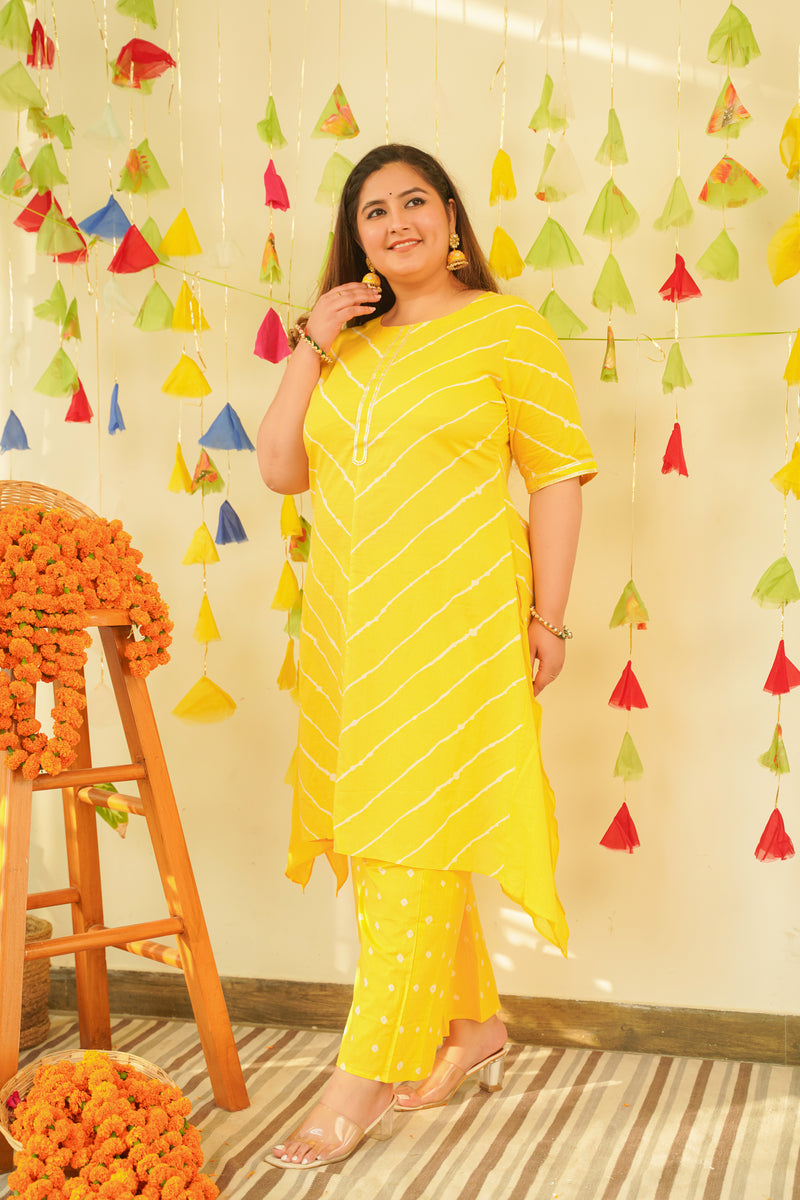A very classic hand tied leheriya kurta set in sunshine yellow color, comes along with a printed bandhej pants. The kurta has gotta detailing on the neck and sleeves. The kurta is hand dyed in leheriya pattern.